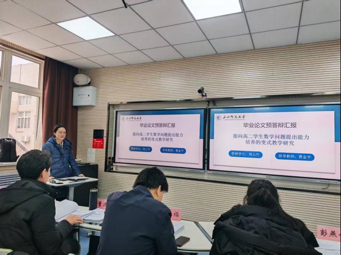 为进一步提升研究生学位论文质量,帮助研究生排查论文撰写中的问题与不足,优化答辩准备工作,根据学校研究生学位论文答辩管理办法及学院研究生培养工作进度安排,2025年12月28日上午,数学与统计组织开展了2023级学科教学(数学)专业硕士研究生学位论文预答辩工作。
