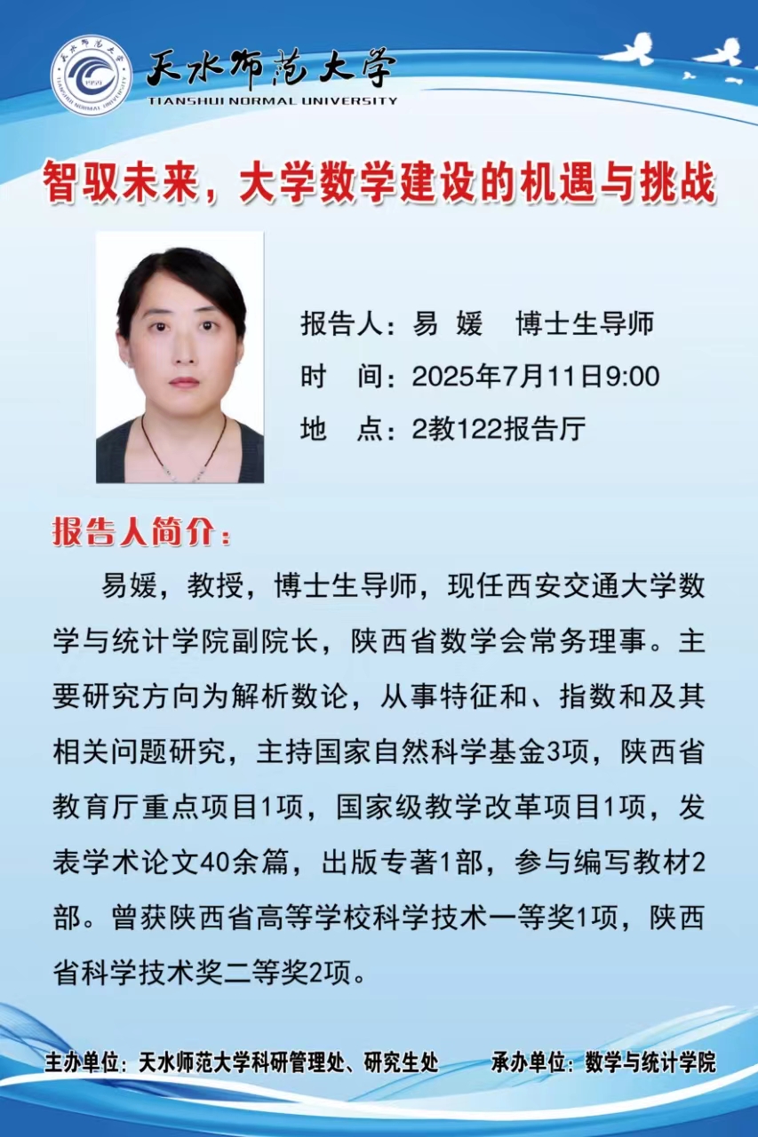 报告人简介:易媛,教授,博士生导师,现任西安交通大学best365唯一官方网站副院长,陕西省数学会常务理事。主要研究方向为解析数论,从事特征和、指数和及其相关问题研究,主持国家自然科学基金3项,陕西省教育厅重点项目1项,国家级教学改革项目1项,发表学术论文40余篇,出版专著1部,参与编写教材2部。曾获陕西省高等学校科学技术一等奖1项,陕西省科学技术奖二等奖2项。