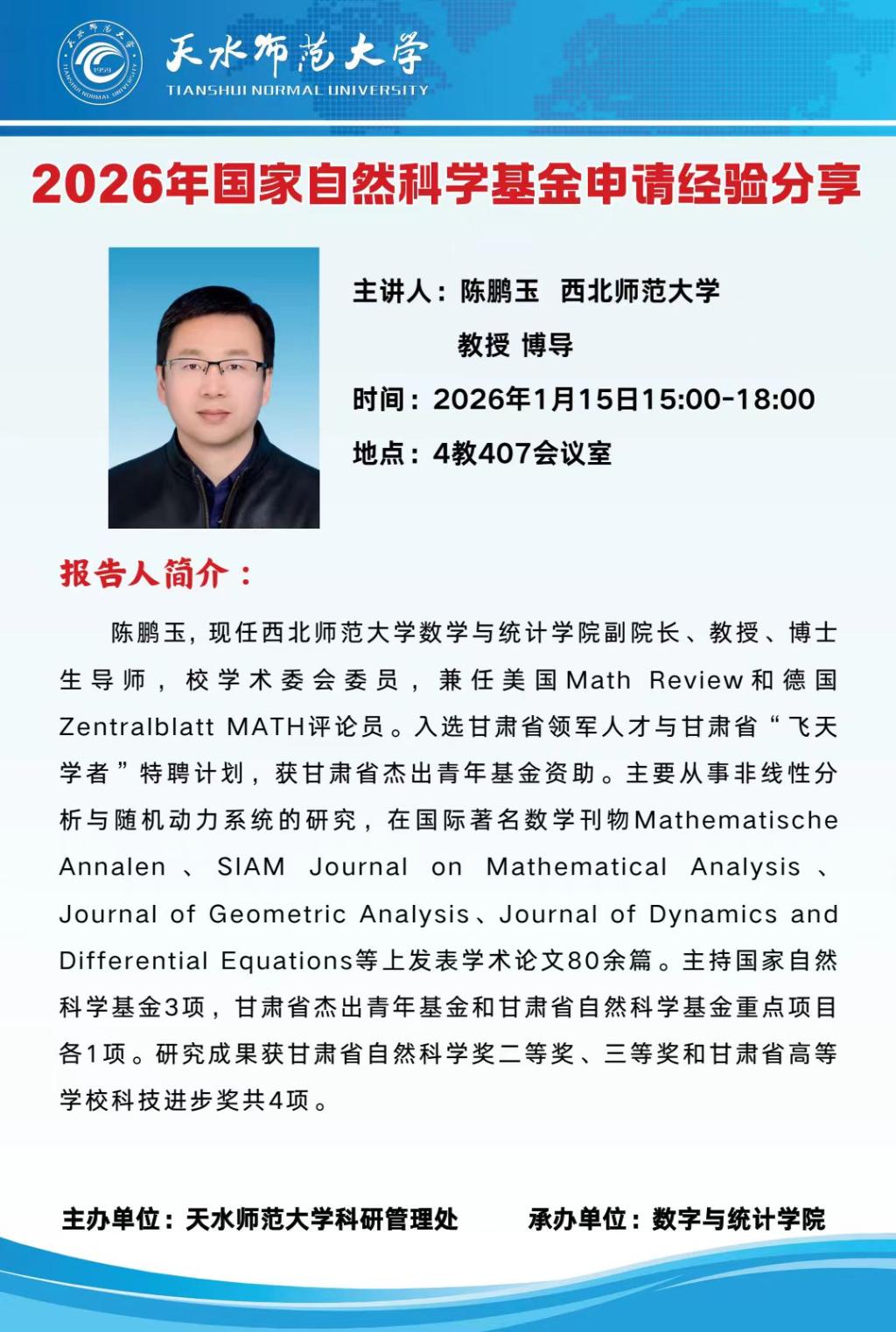 报告人简介:陈鹏玉,现任西北师范大学best365唯一官方网站副院长、教授、博士生导师,校学术委会委员,兼任美国MathReview和德国ZentralblattMATH评论员。入选甘肃省领军人才与甘肃省"飞天学者"特聘计划,获甘肃省杰出青年基金资助。主要从事非线性分析与随机动力系统的研究,在国际著名数学刊物MathematischeAnnalen、 SlAM Journal on Mathematical Analysis 、Journal of Geometric Analysis、 Journal of Dynamics andDifferentialEquations等上发表学术论文80余篇。主持国家自然科学基金3项,甘肃省杰出青年基金和甘肃省自然科学基金重点项目各1项。研究成果获甘肃省自然科学奖二等奖、三等奖和甘肃省高等学校科技进步奖共4项。