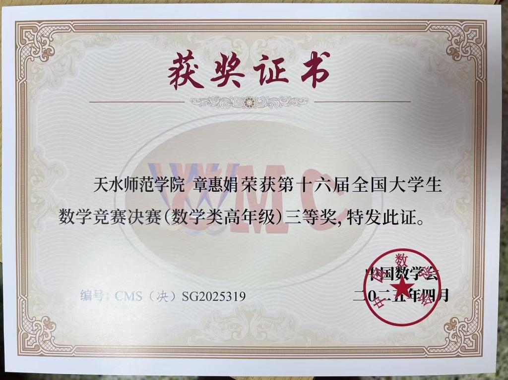 4月11日至13日,由中国数学会举办的第十六届全国大学生数学竞赛决赛在浙江师范大学举行。best365官网2022级数学与应用数学专业章惠娟获得数学类(高年级组)三等奖。